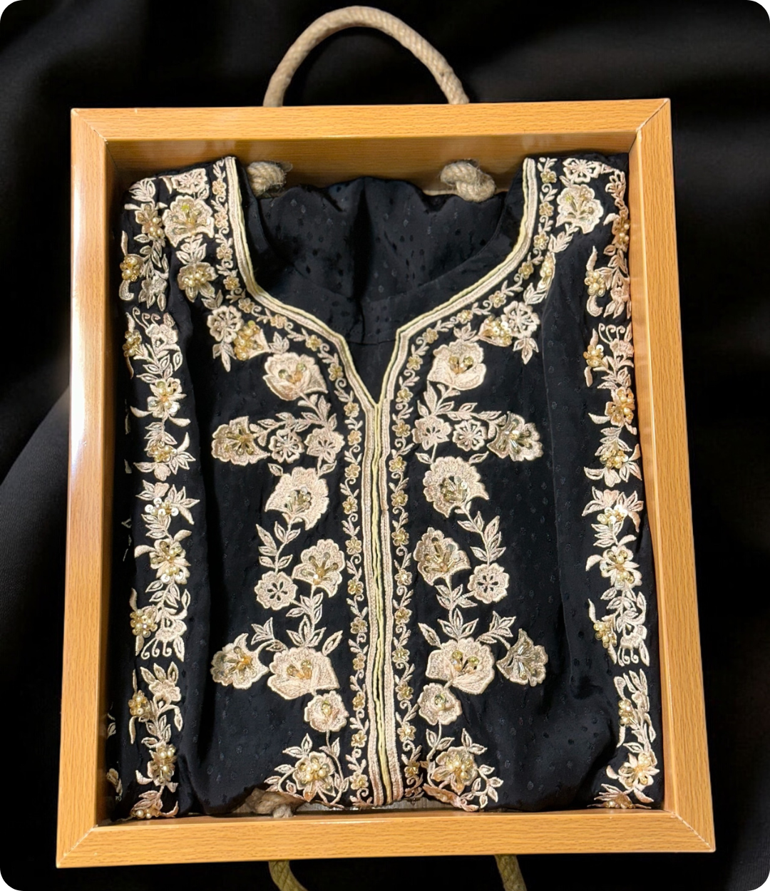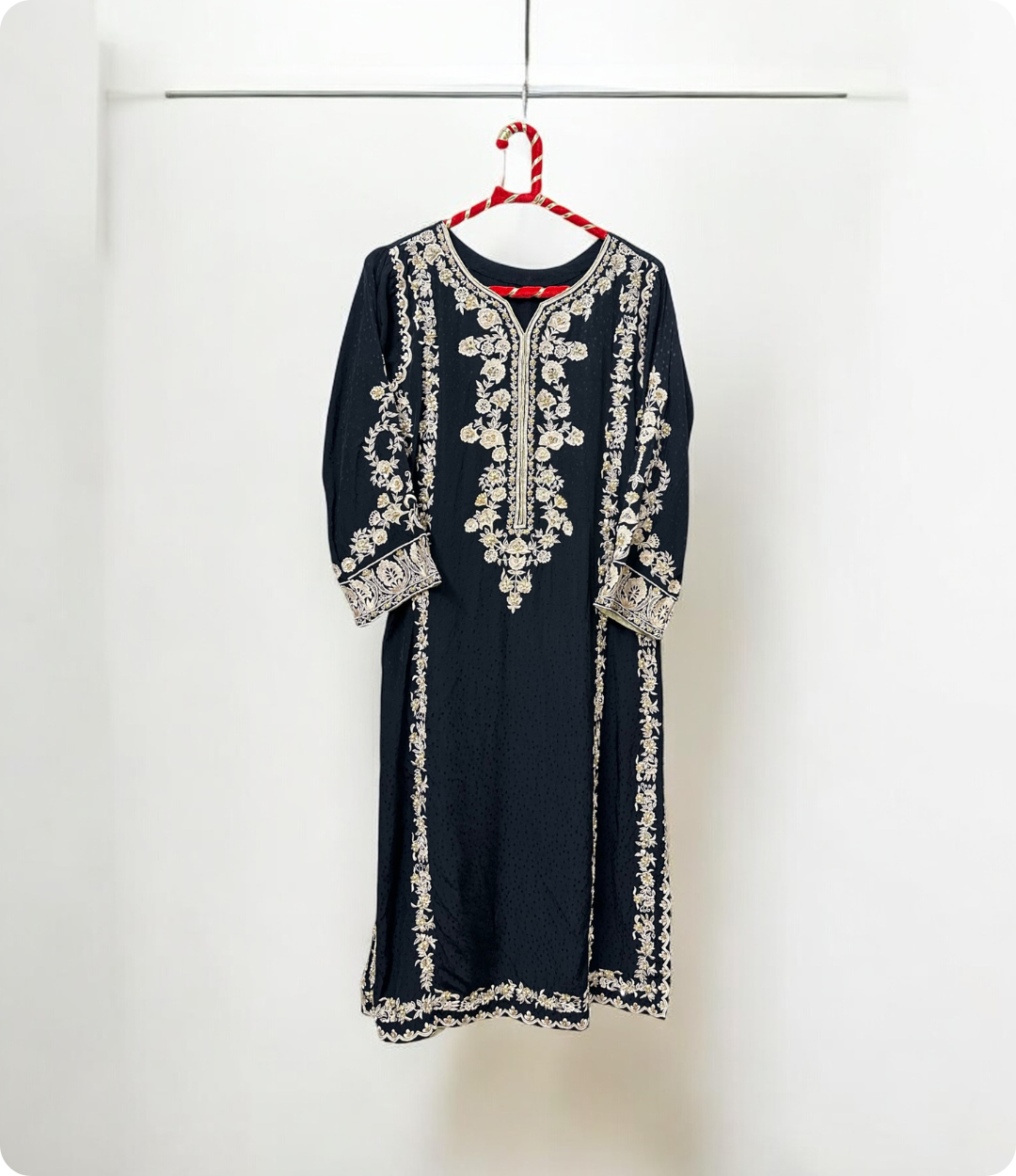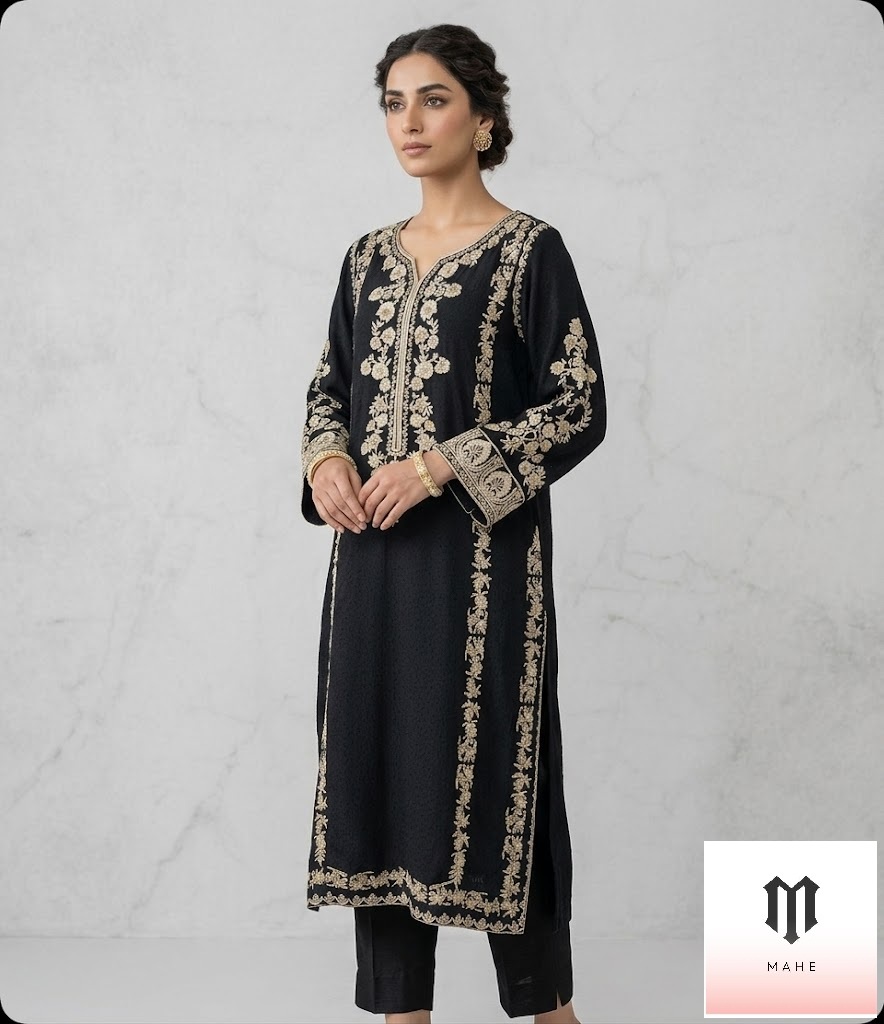 Discover timeless sophistication with this stunning black kurta, richly adorned with intricate gold and ivory thread (resham) embroidery. The design features lush floral motifs running along the sleeves, the hemline, and beautifully framing the V-neck and front panels.