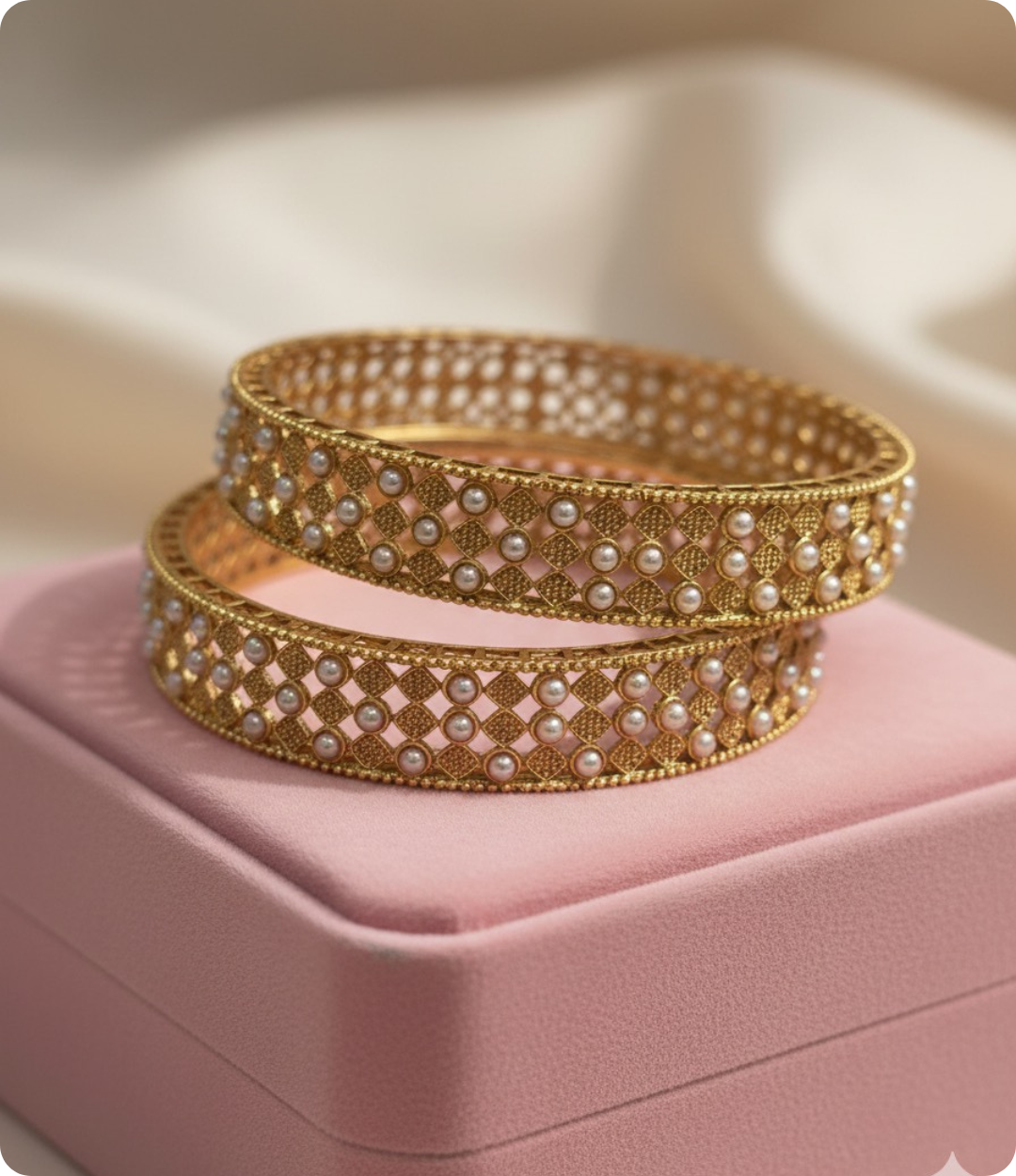 Add a touch of heirloom elegance to your wrists with this exquisite set of Kundan-Style Pearl Lattice Bangles. These bangles are crafted with a rich, matte gold-tone finish that provides a perfect traditional base.