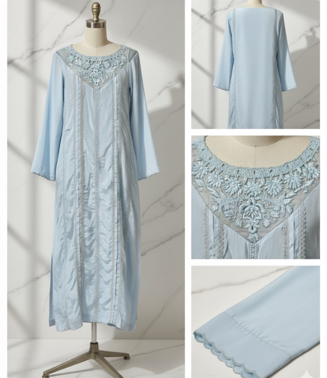 Design Details: Vertical pintucks, delicate lace trim, and scalloped edges on the sleeves