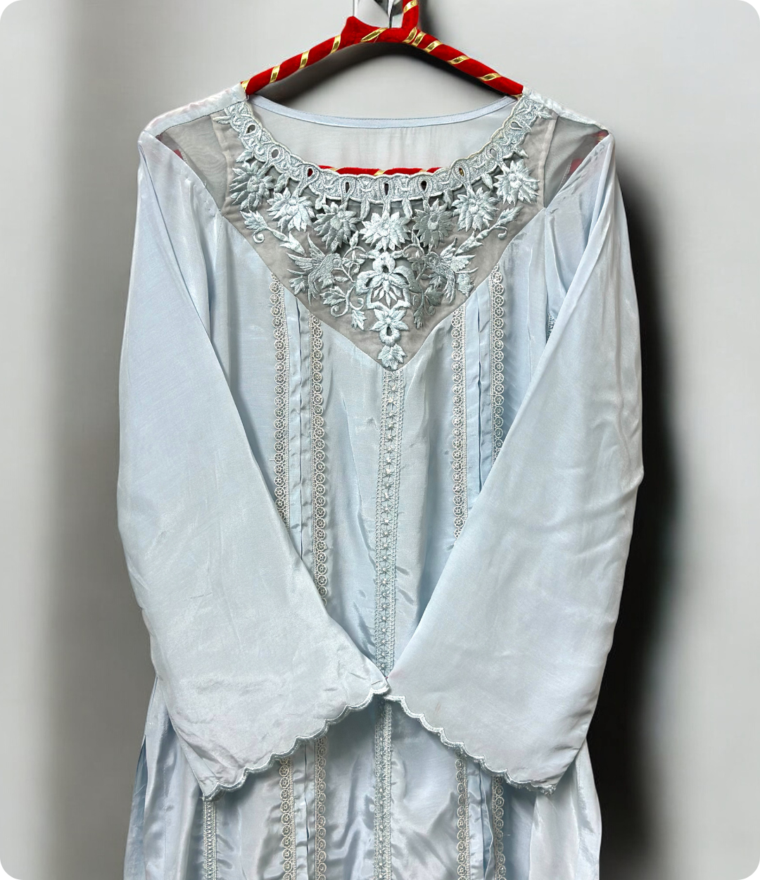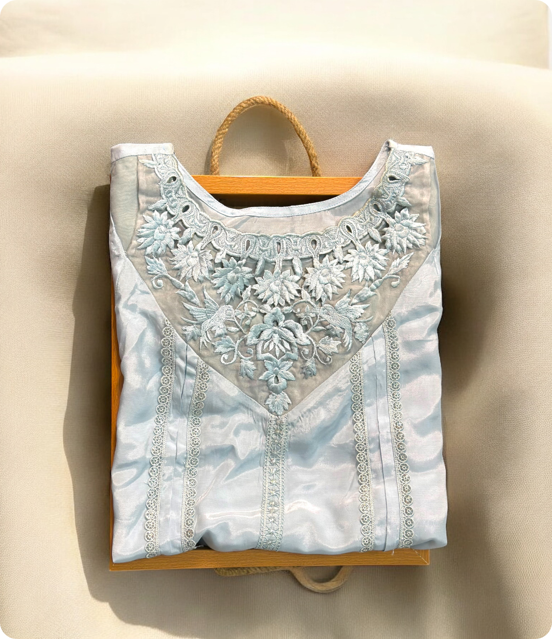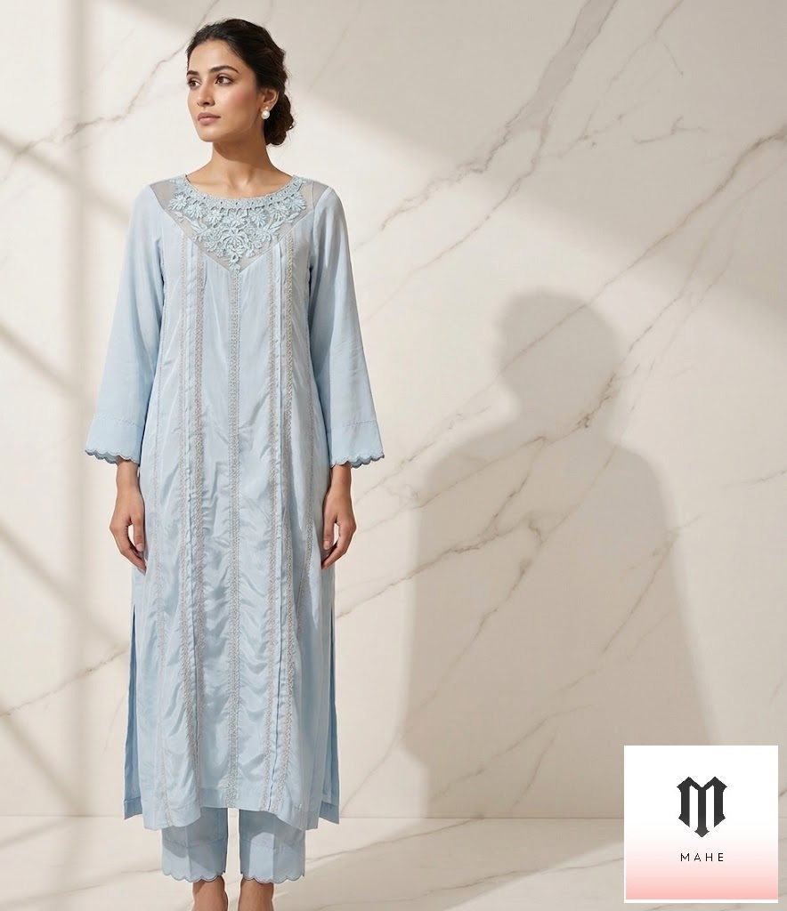A serene ice blue kurta featuring tonal floral embroidery, a sheer embroidered yoke, and fine vertical pintucks for a refined, structured look. Lightweight and elegant—perfect for elevated daytime or semi-formal wear.