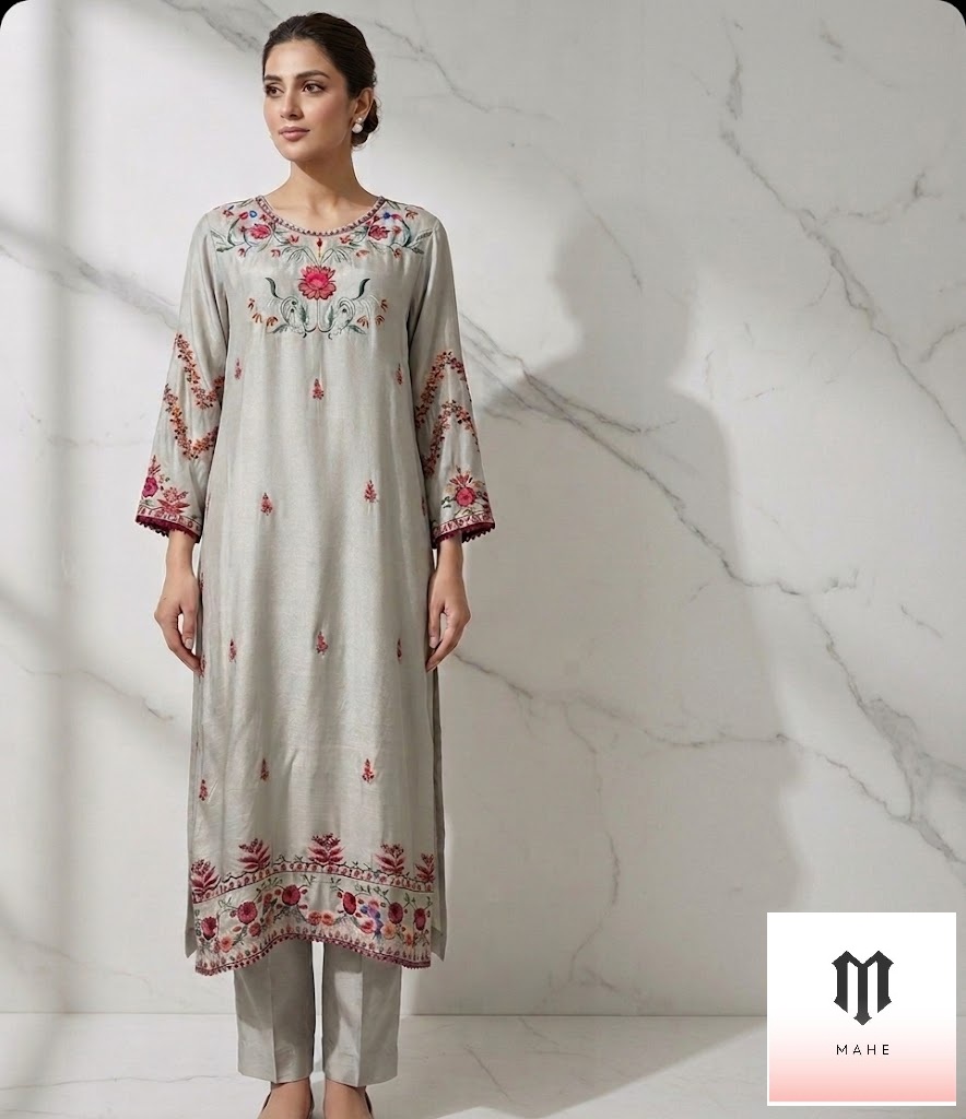 Made from lightweight and breathable fabric, this kurta ensures comfort without compromising on style. The detailed embroidery in rich tones of red, pink, and green brings a refreshing contrast to the soothing grey base, making it perfect for both daytime elegance and evening gatherings.