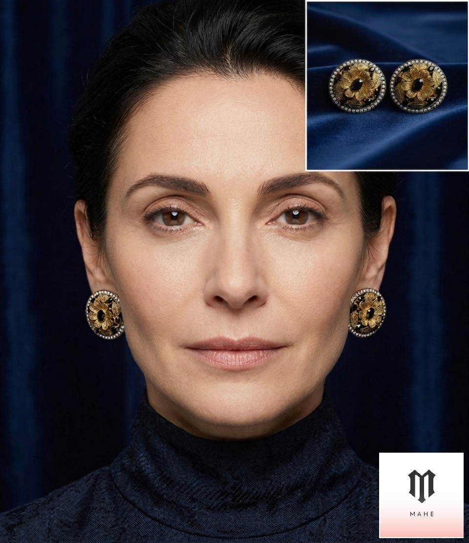 Add a touch of dramatic, old-world glamour to any look with these captivating Turkish-Inspired Floral Stud Earrings. The intricate design showcases detailed, textured antique gold-tone metalwork crafted into a beautiful, multi-layered flower.