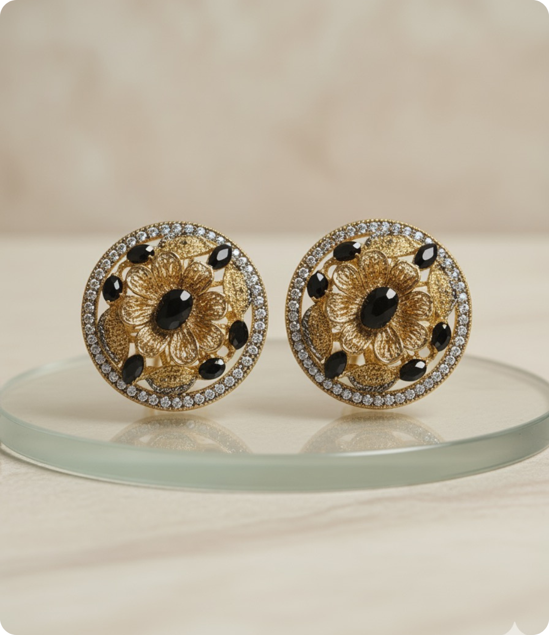 The centerpiece of each earring is a smooth, prominent black round shaped stone, which provides a striking contrast against the warm metal. This dark focal point is surrounded by a dazzling border of tiny, clear rhinestones or crystals, creating a luxurious, sparkling halo effect that frames the entire design.