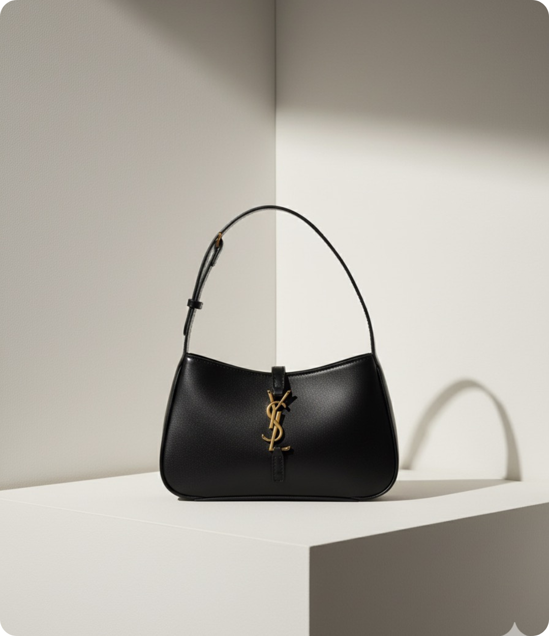 The bag’s soft, slightly structured crescent shape embodies a sophisticated vintage feel, while the adjustable leather strap allows it to sit perfectly on the shoulder. Its minimalist exterior is dramatically contrasted by the bold, polished gold-tone Cassandre (YSL monogram) hook closure, which fastens the strap and secures the main compartment.